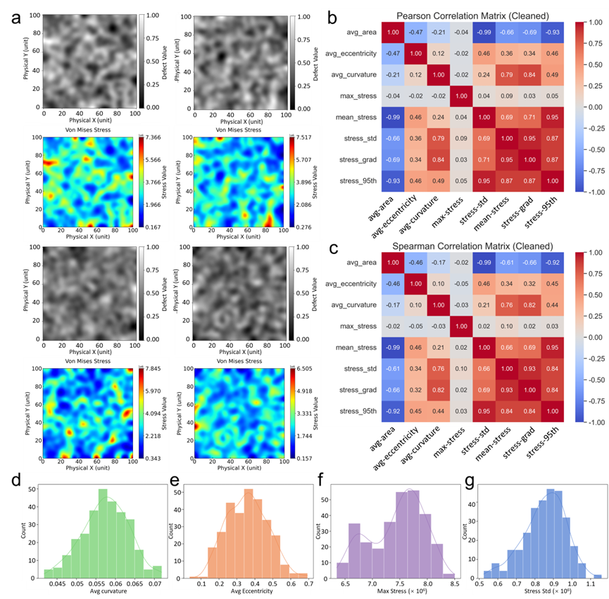 图3. 有限元分析计算结果的统计分析。(a) 典型缺陷分布及对应应力场。(b) 统计结果的皮尔逊相关热图。(c) 统计结果的斯皮尔曼相关热图。柱状图显示(d) 曲率Cr和(e) 偏心率Ec在所有缺陷分布图中的分布情况,(f) 最大应力以及(g) 应力标准差在所有对应应力场分布图中的分布情况。