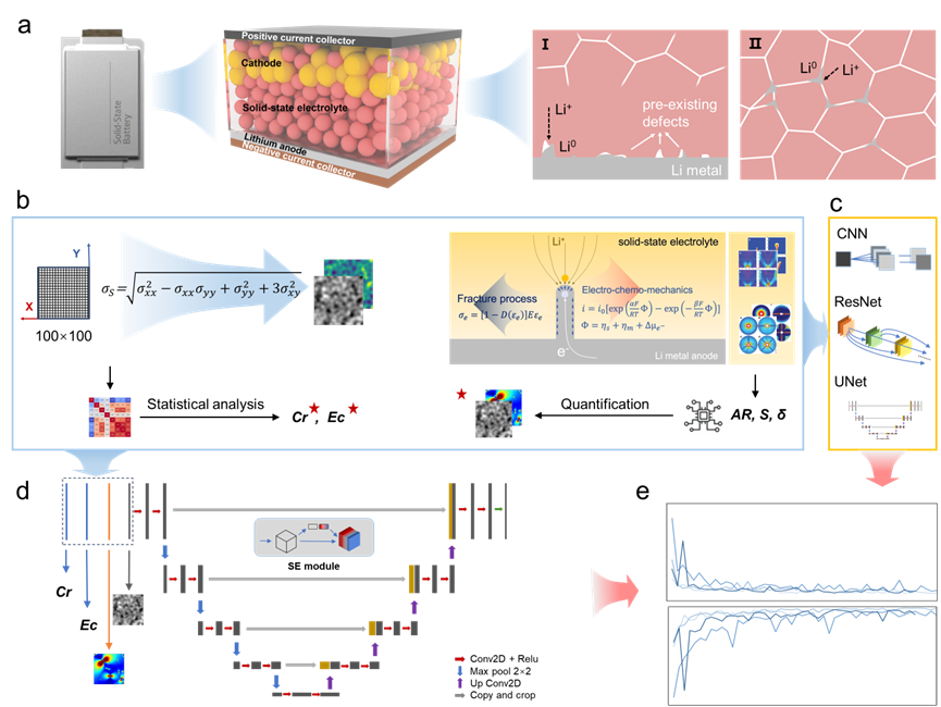 图1. 固态电池界面失效示意图及机器学习模型框架。(a) 固态电池结构示意图及其界面失效机制;(b) 左半部分:通过有限元分析计算的固态电解质缺陷及其对应应力场。右半部分:通过量化分析先验知识生成的先验应力场分布图;(c) 三种机器学习模型的示意图,包括CNN、ResNet以及UNet;(d) 本研究开发的SE-UNet模型框架;(e) SE-UNet模型与其他三个模型的性能对比。