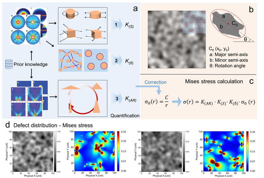 图2. 基于先前研究工作的先验知识定量分析流程。(a) 先验知识通过三个校正指标进行量化提取:缺陷对称性K(S)、缺陷尺寸与密度K(δ)以及缺陷长宽比K(AR);(b) 缺陷分布处理流程。每个缺陷被标准化为独立椭圆来进行计算分析;(c) 利用上述修正参数计算米塞斯应力;(d) 缺陷分布及其对应的量化先验应力场。