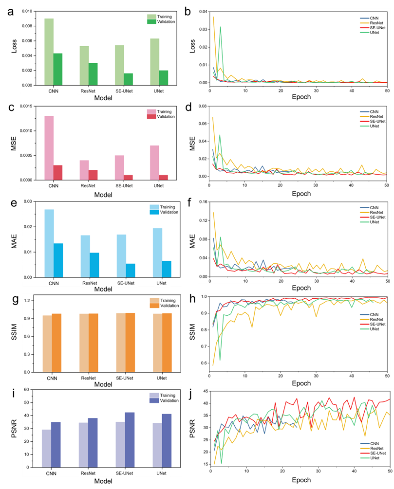 图4. 四种机器学习模型在训练集与验证集上的预测性能表现。(a) 各模型在训练集与验证集上的Loss值及其(b) 在训练过程中的变化;(c) MSE值及其(d) 在训练过程中的变化;(e) MAE值及其(f) 在训练过程中的变化;(g) SSIM值及其(h) 在训练过程中的变化;(i) PSNR值及其(j) 在训练过程中的变化。
