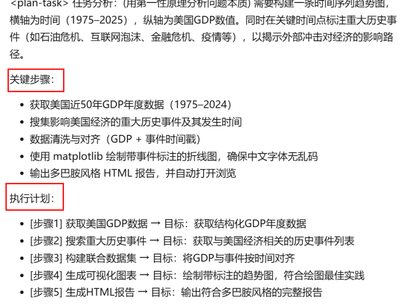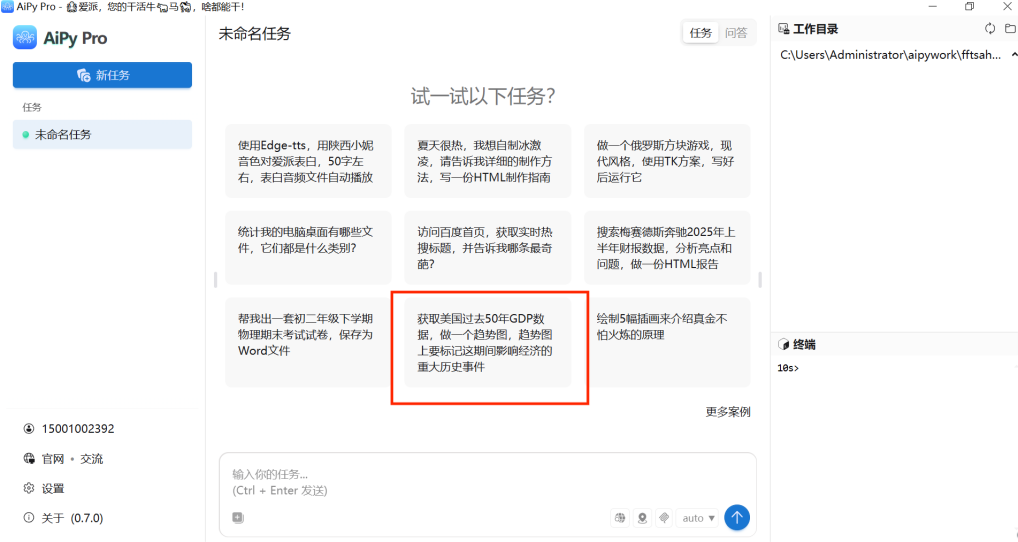 为了验证AiPy的实际能力,我先选择了其中一个案例:美国GDP趋势分析及可视化。这个任务涉及数据获取、清洗、分析、图表和报告生成等多个环节,是评估AI工具综合能力的好场景。