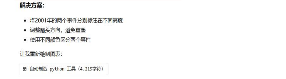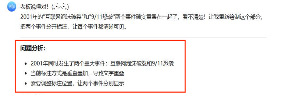 AiPy立马分析了问题所在:2001年同时发生了两大重大时间,标注方式又是垂直叠加,导致文字重叠。