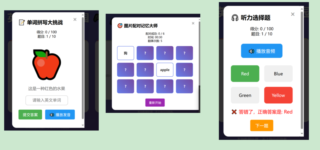 并且,正确和错误都有不同的音效,体验感还是不错的!