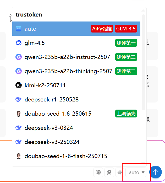 4、AiPy能够更换模型配置,它自带的免费模型还是很丰富的,GLM4.5、DeepSeek、Qwen、Doubao等国产主流模型都囊括了,AiPy官方建议使用auto模型。