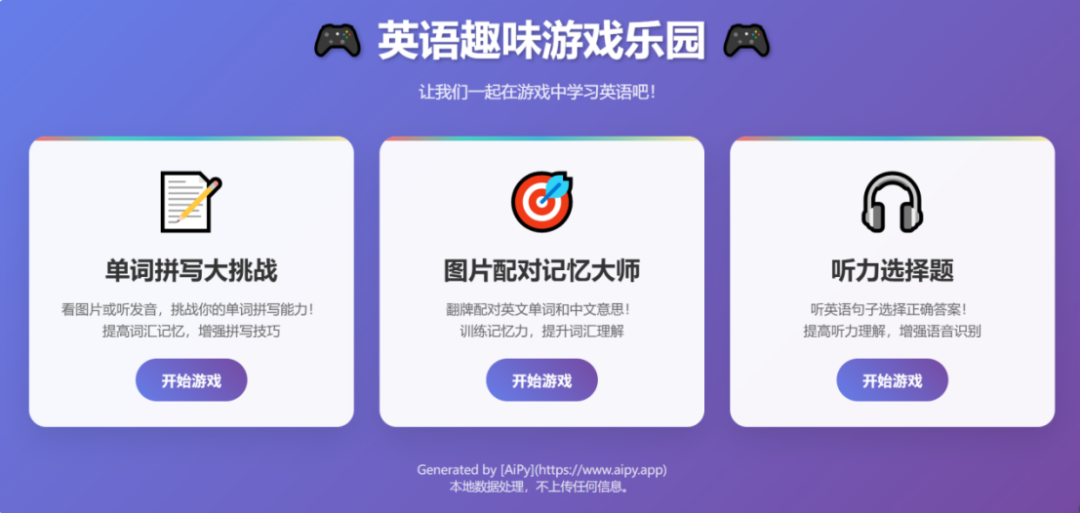 考虑到AiPy声称能够处理多媒体内容,我尝试了一个更有挑战性的任务——开发一个小学生英语学习游戏。动机很简单:堂哥最近问我,有没有适合低年级孩子寓教于乐的英语软件。我索性用 AiPy 现场造一个。