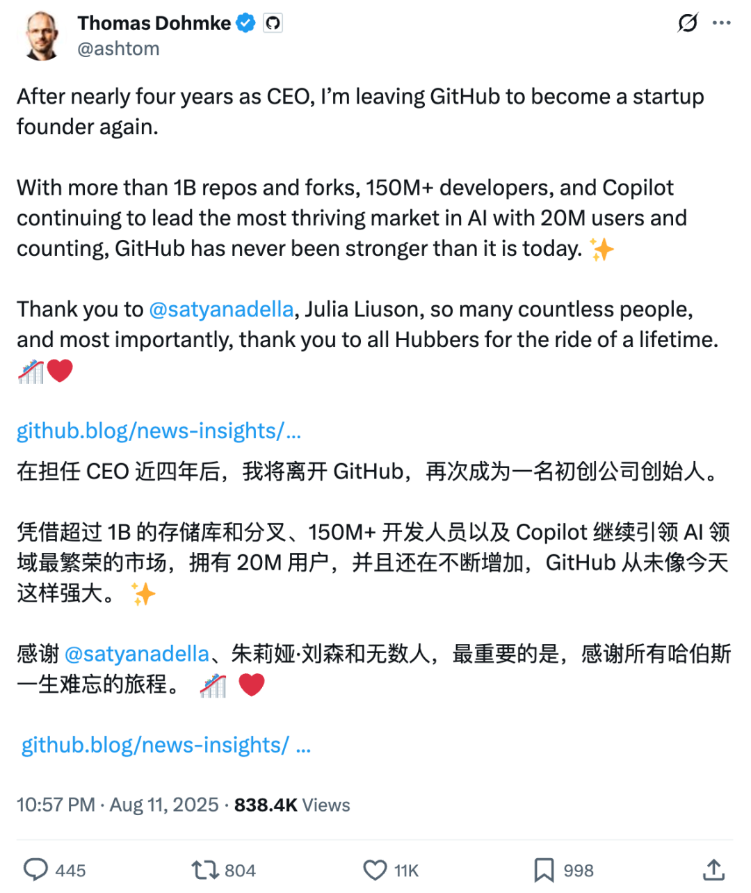 GitHub CEO Thomas Dohmke 今天突然宣布辞职,并透露 GitHub 将整体并入微软新成立的CoreAI。