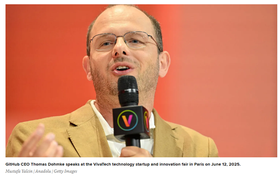 自2021年起担任GitHub首席执行官Thomas Dohmke,于2015年通过微软收购他此前创立的HockeyApp公司加入微软。2018年微软以75亿美元收购GitHub后,Dohmke于2021年中期转任该业务的产品主管,并于几个月后接替Nat Friedman成为GitHub首席执行官。