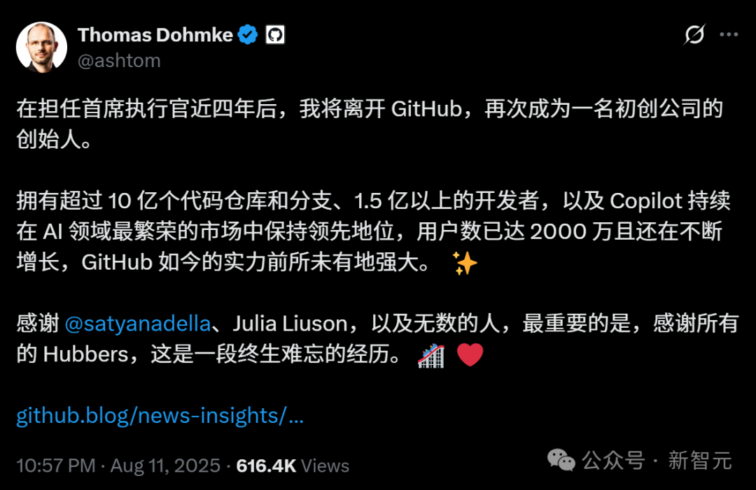 在离职声明中,Dohmke表示:从移动开发工具,到参与并推动GitHub收购,再到担任CEO,领导GitHub进入Copilot与AI的新时代,这是一段终生难忘的旅程。