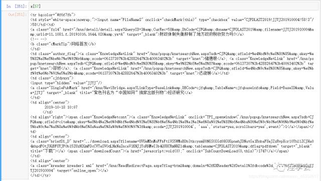 'tr' )[ 7 : 57 ]: #在soup搜索出来的tr标签中,列表头尾都有冗余信息,删掉不要 transfer_list.append(i) len(htmls) #看一下爬出来多少的html,我的结果是135个html页面 raw_paper_infos = [] #用re匹配的思路是,第一步先缩小范围,第二步,精确搜索并删除多余的字符,下面是第一步 for i in transfer_list: #遍历transfer_list中的每一个tr标签,其结构:[[一个tr标签包含的源码],[].……] o=[] #中转列表,储存第一步搜索出来的title,authors,发布时间,下载链接四个大致的匹配结果 paper = str(i) #下面正则的表达式,都是我自己试出来的,有更好的方法欢迎留言 title = re.findall( 'target="_blank">.*' ,paper) authors = re.findall( 'target="knet">.*' ,paper) pub_year = re.findall( '....-..-..' ,paper) download_url = re.findall( 'briefDl_D" href=".*PDFdown' ,paper) quoted_num1 = re.findall( 'scrollbars=yes.* ,paper) download_num = re.findall( 'onclick="SubCountDownLoad.*' ,paper) o=[title,authors,pub_year,download_url,quoted_num1,download_num] raw_paper_infos.append(o) #初步储存了全部的搜索信息 初步搜索出来的结果如下: