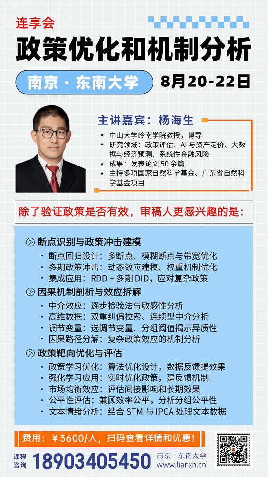 🍓 课程推荐:连享会:2025政策优化和机制分析专题 嘉宾:杨海生教授,中山大学 时间:2025 年 8 月 20-22 日 地点:东南大学榴园会议中心 (南京市玄武区进香河路38号) 咨询:王老师 18903405450(微信)