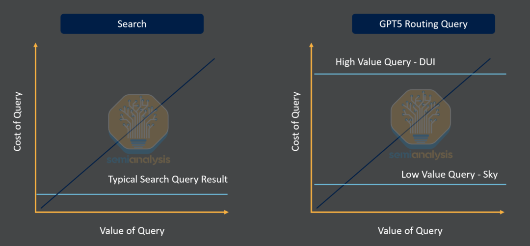 在「Router」出现之前,系统无法区分这两种查询。而现在,第一个低价值查询可以被导向一个 GPT-5 mini 版本,这个模型可以在不调用任何工具或进行深度推理的情况下回答。服务这类用户的成本,已接近于一次传统的搜索查询。