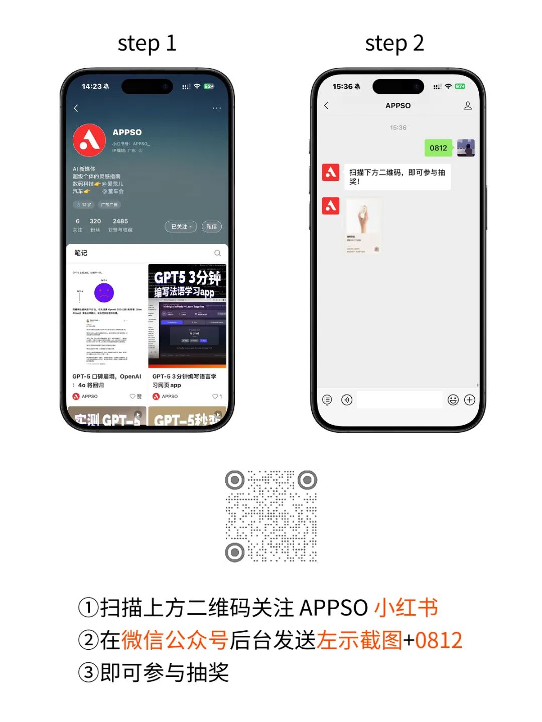 即日起至 8 月 31 日,扫描图二中的二维码,关注 APPSO小红书,在公众号后台发送关注截图及关键词「0812」,抽两位小伙伴, 各送出一个68W C³ 充电器。