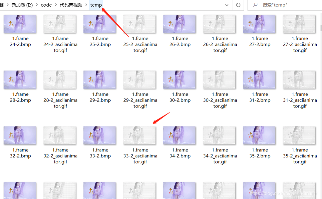 我们可以在目录文件下找到temp文件,里面就是存储的每个gif中每一帧转换的ASCII的gif。下面我们就是需要处理这些ASCII的gif,可以将文件夹拷贝到python项目下面。