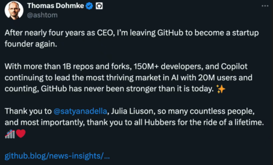 2025 年 8 月 11 日,一则消息震动全球开发者社区:GitHub CEO Thomas Dohmke 宣布辞职,而 GitHub 将结束独立运营,整体并入微软 CoreAI 部门,且微软不再为其寻找新 CEO。
