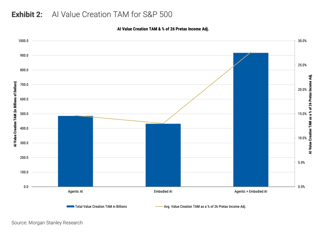 其中的一项分析称,由AI带来的颠覆性变革,或能为标普500公司每年节省9200亿美元的成本——相当于总薪酬的41%,或2026年税前利润的28%。