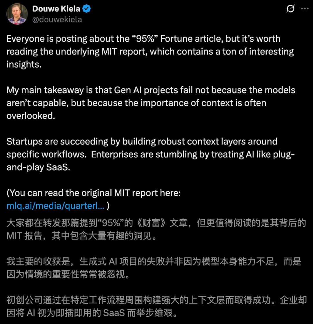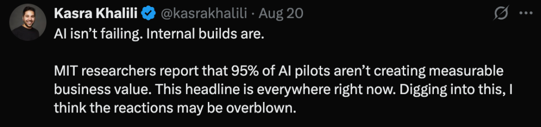 一位VC投资人Kasra Khalili一句话道出了真理,「AI并没有失败,而是公司内部构建系统的失败」。