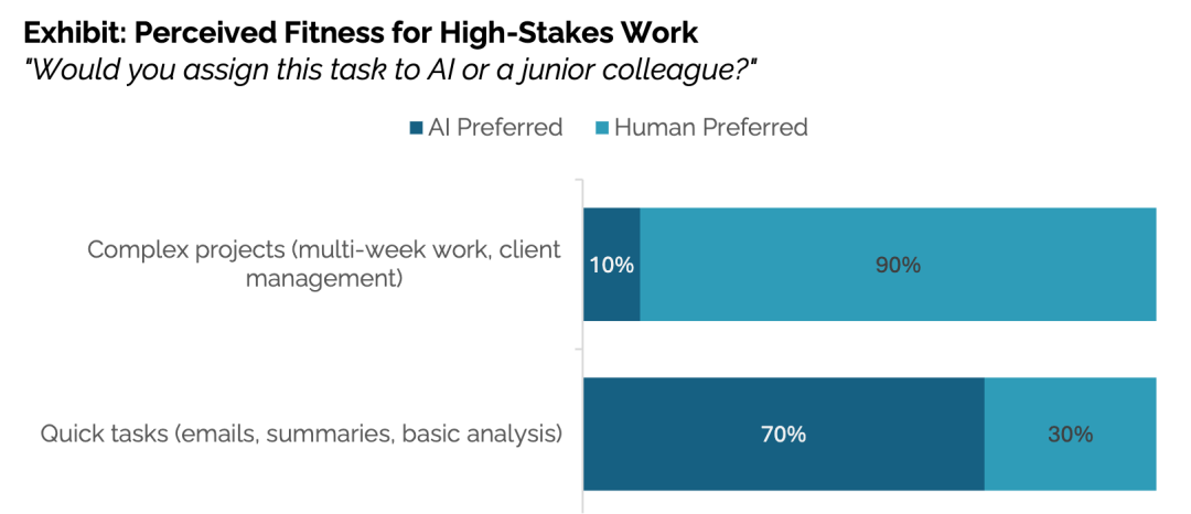 70%员工在处理邮件、基础分析等快速任务时,直接找AI而非同事;但对于复杂的、高风险的工作,90%员工更信任人类。