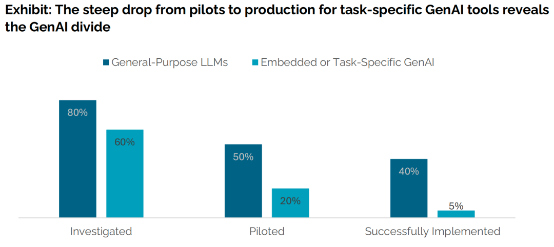 像ChatGPT这样的通用AI工具投入生产的成功率为40%,而针对特定任务的企业级工具成功率仅为5%