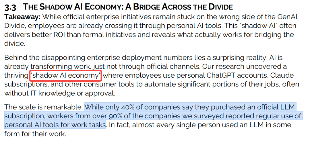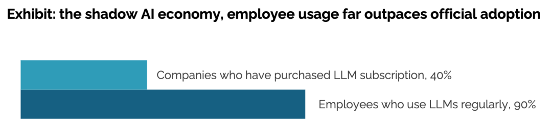 换句话说,员工使用AI频率,是企业采纳率的2倍多,这种现象被称为「影子AI经济」。