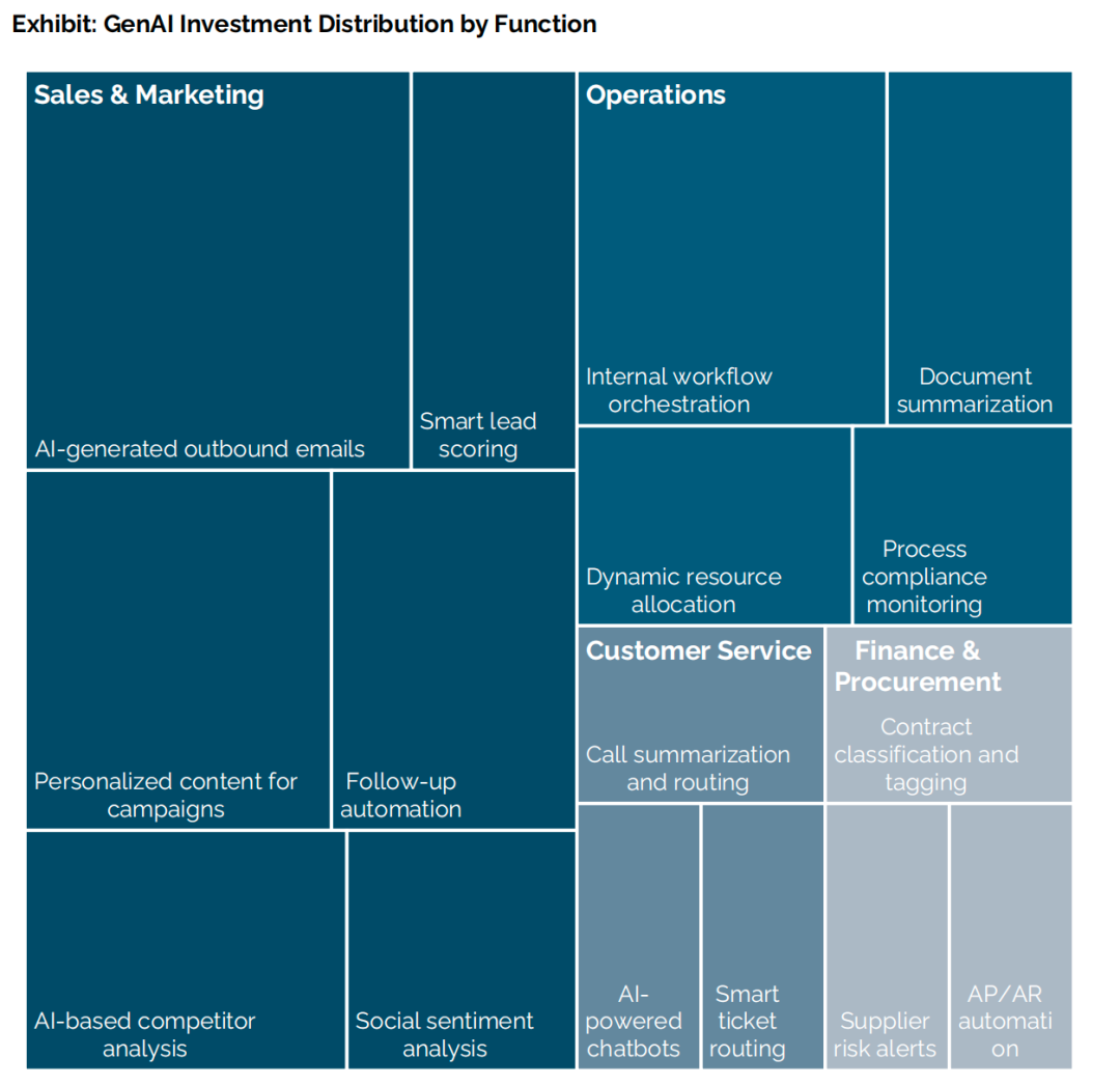 另一个需要注意的点是,企业AI预算中,有一半都砸在了销售和营销上。