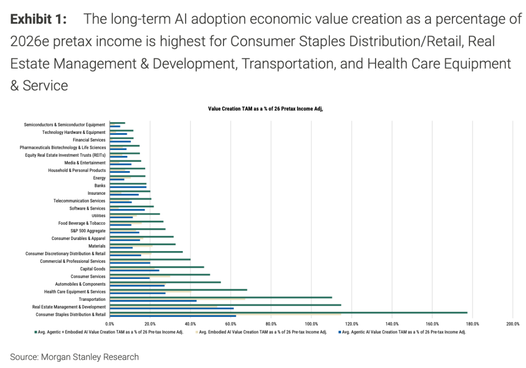 比如日常消费品的分销与零售、房地产管理以及交通运输业是受冲击最大的几个行业。其中,由AI驱动的潜在生产力提升,预计将超过2026年预测收益的100%。