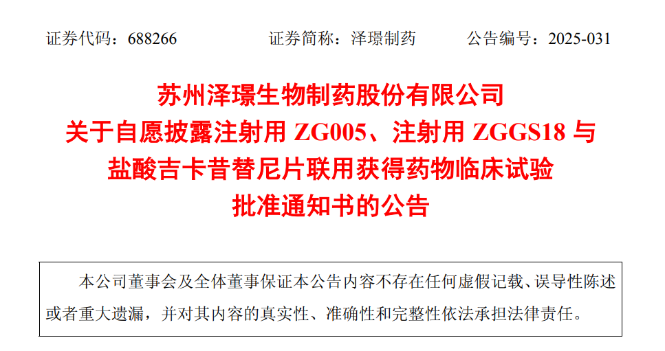 近日,泽璟制药收到国家药监局核准签发的《药物临床试验批准通知书》,注射用ZG005、注射用ZGGS18与盐酸吉卡昔替尼片联合用于晚期实体瘤的临床试验获得批准。注射用ZG005是重组人源化抗PD-1/TIGIT双特异性抗体,为创新型肿瘤免疫治疗生物制品,注册分类为1类,有望用于治疗多种实体瘤。根据公开查询,ZG005是全球率先进入临床研究的同靶点药物之一,目前全球范围内尚未有同类机制药物获批上市。ZG005拥有双靶向阻断PD-1和TIGIT的作用,既可以通过有效阻断PD-1与其配体PD-L1的信号通路,进而促进T细胞的活化和增殖;又可以有效阻断TIGIT与其配体PVR等的信号通路,促使PVR结合CD226产生共刺激激活信号,进而促进T细胞和NK细胞的活化和增殖,并产生两个靶点被同时阻断后的协同增强免疫系统杀伤肿瘤细胞的能力。注射用ZGGS18是一种重组人源化抗VEGF/TGF-β的双功能抗体融合蛋白,注册分类为治疗用生物制品1类,有望成为治疗实体瘤的创新型生物制品。ZGGS18可以特异性地结合血管内皮生长因子(VEGF)和“捕获”转化生长因子-β(TGF-β),起到抑制肿瘤新生血管形成和降低肿瘤转移发生等协同抑制肿瘤生长的多重作用。另外,ZGGS18也可以改善和调节肿瘤微环境,从而可以和抗PD-1/L1抗体、公司正在开展临床研究的抗PD-1/TIGIT双特异性抗体ZG005等肿瘤免疫治疗药物联合增强肿瘤杀伤作用。盐酸吉卡昔替尼(曾用名:盐酸杰克替尼)是公司自主研发的一种新型JAK和ACVR1双抑制剂类药物,属于1类新药,公司拥有该产品的自主知识产权。盐酸吉卡昔替尼片治疗中、高危骨髓纤维化适应症的NDA申请已获国家药监局批准,是首个获批用于治疗骨髓纤维化的国产JAK抑制剂类创新药物。盐酸吉卡昔替尼片治疗重度斑秃适应症的NDA申请已经获得国家药监局受理。同时,盐酸吉卡昔替尼片目前正在开展多个其它免疫炎症性疾病的关键临床研究,包括用于中重度特应性皮炎(III期)、强直性脊柱炎(III期)等。此外,吉卡昔替尼片用于治疗12岁及以上青少年和成人非节段型白癜风患者的II/III期临床试验已获得批准。吉卡昔替尼片用于治疗骨髓纤维化的研究获得国家“重大新药创制”科技重大专项立项支持。泽璟制药是一家专注于肿瘤、出血及血液疾病、免疫炎症性疾病等多个治疗领域的创新驱动型化学及生物新药研发和生产企业,致力于研发和生产具有全球自主知识产权、安全、有效、患者可负担的创新药物,以满足国内外巨大的临床需求。公司自成立以来,坚持独立自主的原始创新和改良再创新并重的发展策略。在研药品注重肿瘤、出血及血液疾病、免疫炎症性疾病等领域,填补国内空白,为尚未满足的临床需求提供治疗选择。公司注重同时布局大病种疾病和罕见病,注重在研药品的领先性、可及性、广谱性或特效性,从而形成产品管线的差异化综合竞争优势。 公司建立了三个研发中心、三条GMP生产线,形成了泽璟在江苏昆山、上海张江、美国加州的拥有技术和资源优势的全球发展框架,最大限度地发挥泽璟在小分子新药和生物大分子新药的研发和产业化潜能。