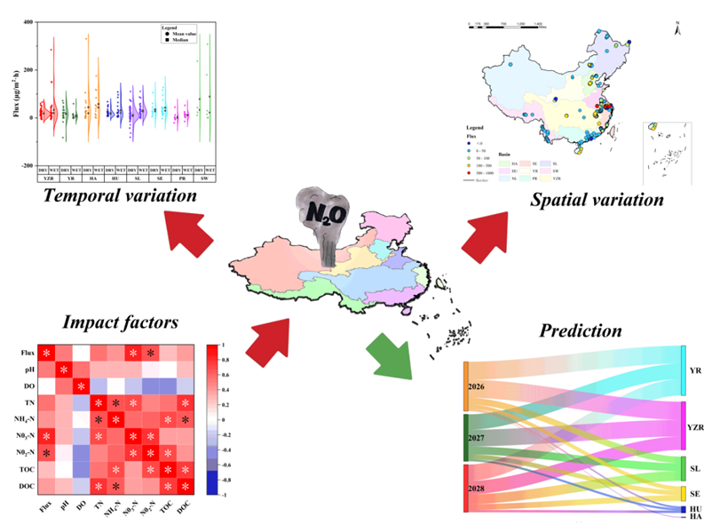 YR)在旱季的N₂O通量反而高于雨季。这可能与该区域湿地覆盖度高、植被类型丰富有关。湿地植物可通过以下方式调控N₂O排放:根际分泌物改变微生物群落结构;植物通气组织作为气体传输通道,影响N₂O的释放路径;湿地表层土壤中形成强烈的厌氧环境,有利于完全反硝化至N₂,减少中间产物N₂O的积累。类似的趋势也出现在长江流域(YZR)部分湿地采样点中,即湿地水体在雨季N₂O通量反而低于旱季。但由于全国范围内湿地样点所占比例较低,因此在整体趋势上,仍以“雨季高、旱季低”为主。