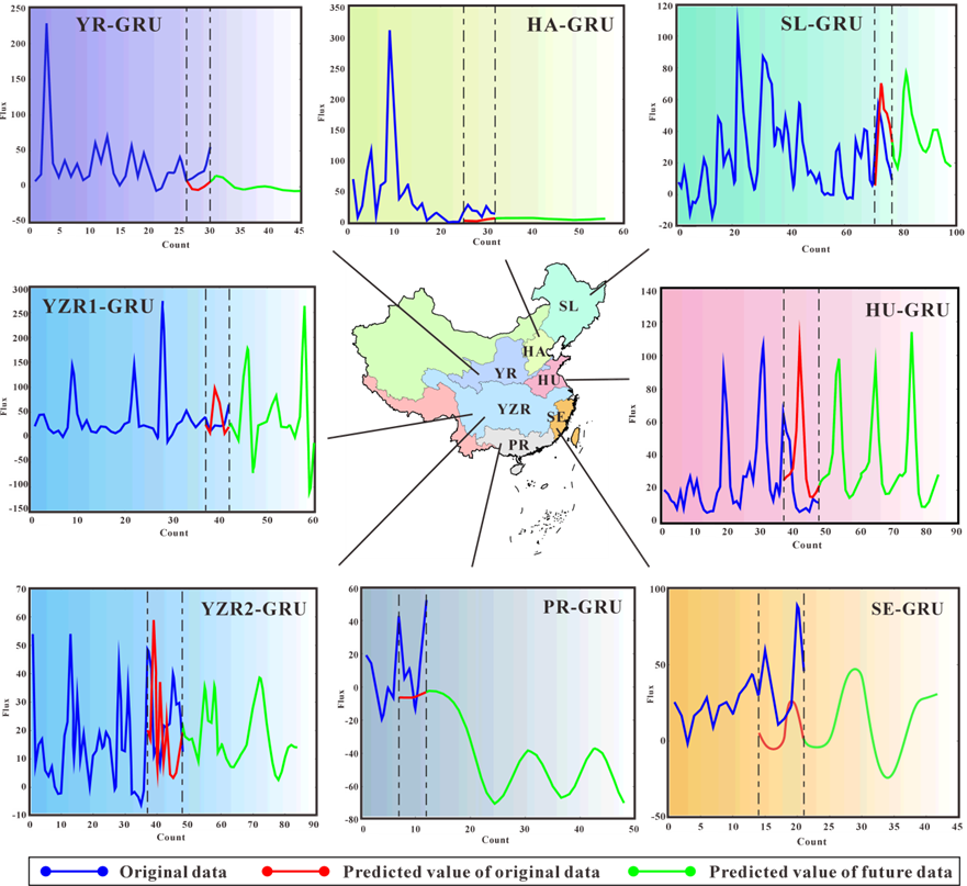 排放总通量的预测结果存在一定差异。总体趋势显示,中国淡水系统的N₂O排放总量呈轻微下降态势,但各模型在不同流域的表现差异,进而影响其对全国总量的判断。具体而言,LSTM模型在多个流域(如YR、HU、HA)中预测出明显的通量下降趋势,尤其是在黄河与淮河流域,未来N₂O排放近乎归零甚至出现负值,导致其对全国总排放的预测值最低。但LSTM在长期预测中出现波动性大、异常值敏感的问题,整体预测精度相对较低。GRU模型对多数流域的排放预测更具周期性与稳定性,通量波动幅度较小,表现出相对平稳的总量变化趋势。尽管在珠江流域(PR)等数据稀缺区域存在一定误差,但GRU对全国排放总量的预测更为中性,未出现极端下降或上升。相比之下,BiLSTM模型在预测全国N₂O排放总量方面表现最为稳健与可信。其在多个流域(如SL、SE、YZR)中识别出季节性周期波动,并有效避免了异常值导致的预测偏差。BiLSTM预测显示全国排放总量将略有下降,部分流域(如YZR)虽仍贡献较高通量,但整体趋势趋于平缓。此外,BiLSTM预测中不再出现像LSTM那样的大幅负值,提升了全国尺度总量预测的可信度。