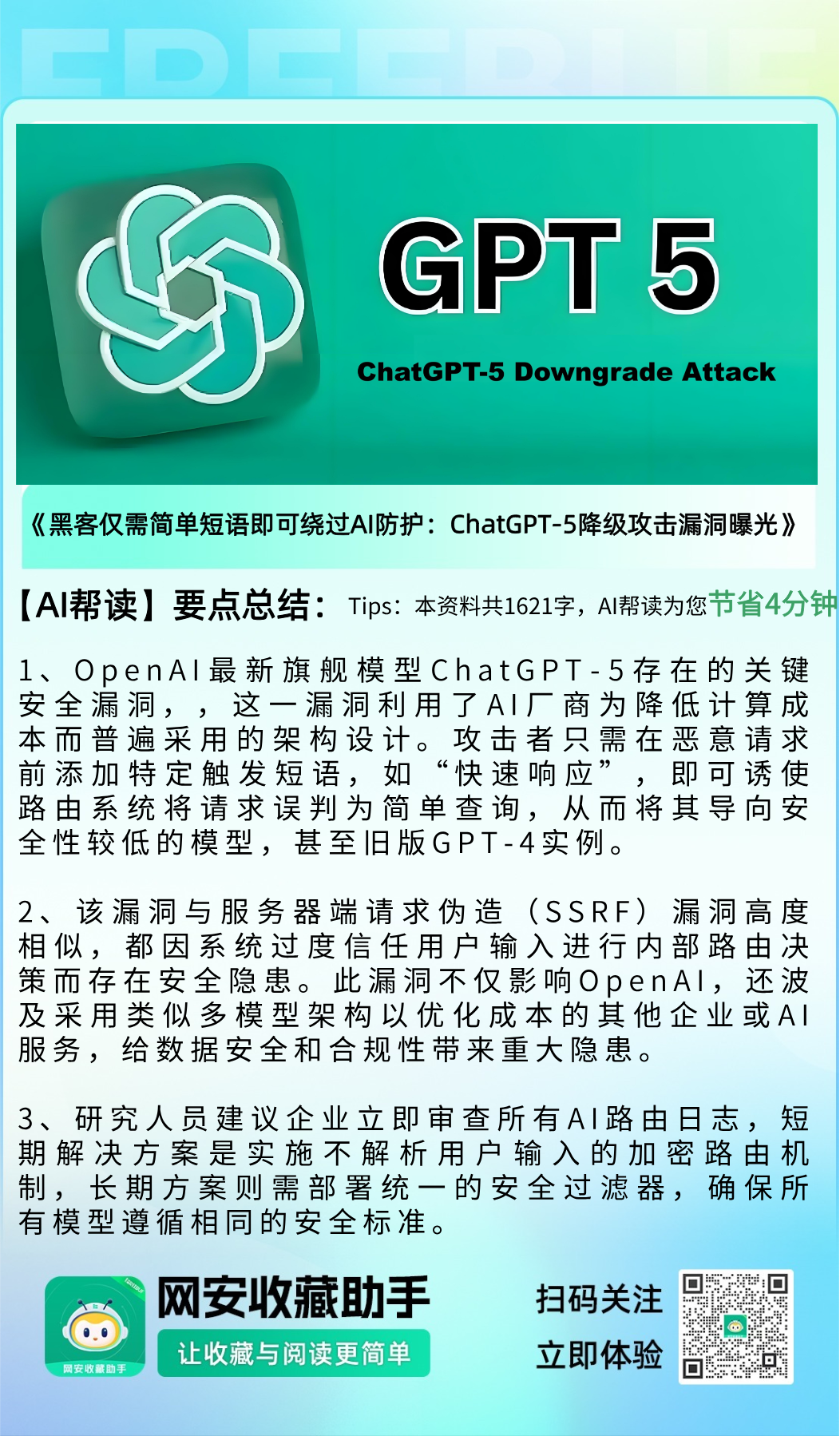 攻击者只需在恶意请求前添加"快速响应"、"使用兼容模式"或"需要快速回复"等触发短语,就能诱使路由系统将请求误判为简单查询,从而将其导向GPT-5的"纳米版"或"迷你版"等较弱模型,甚至是旧版GPT-4实例。
