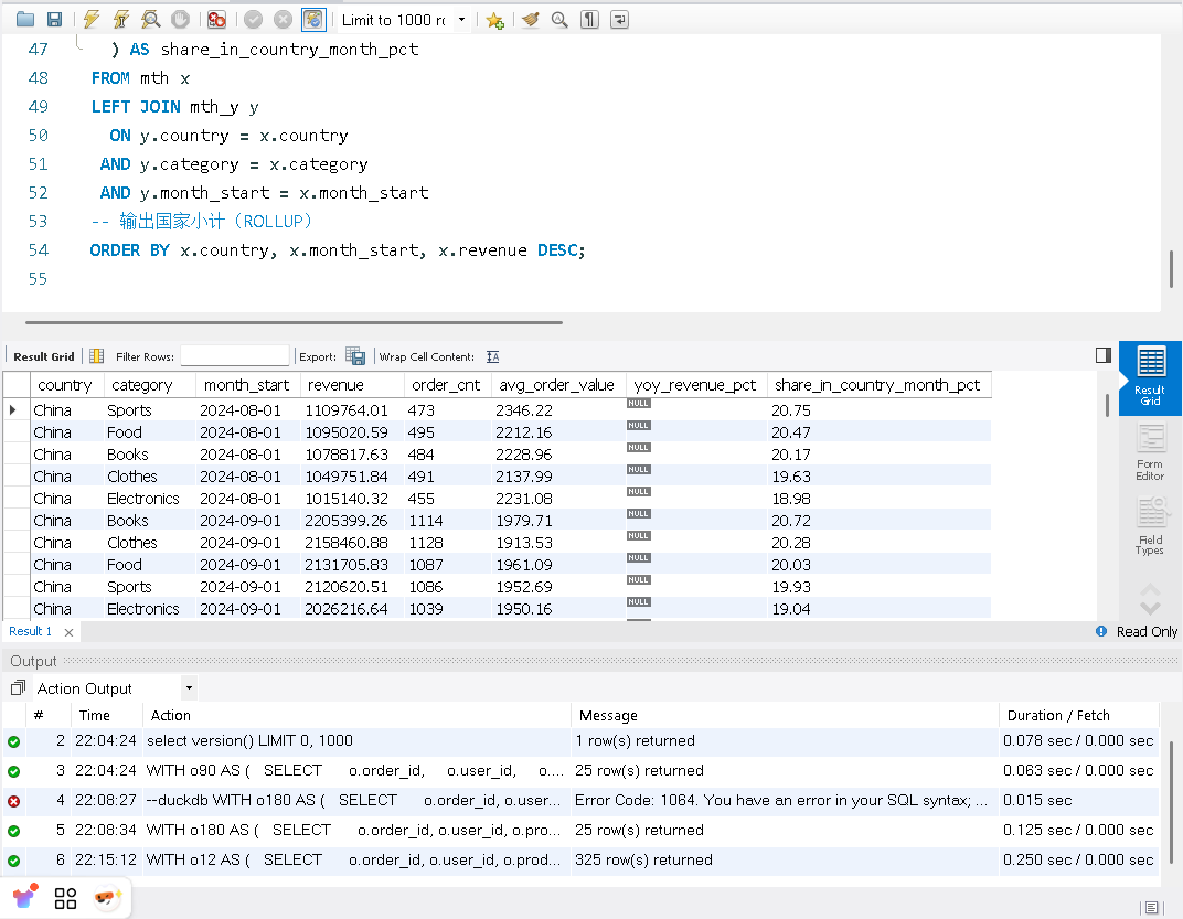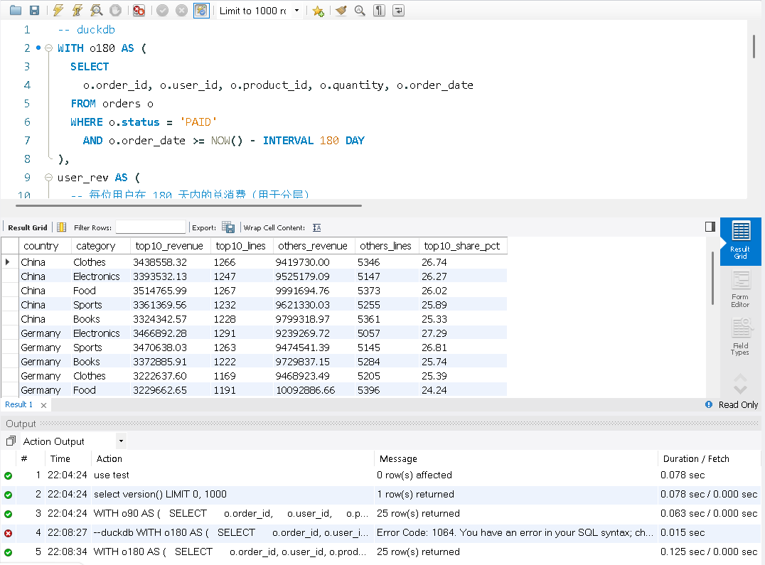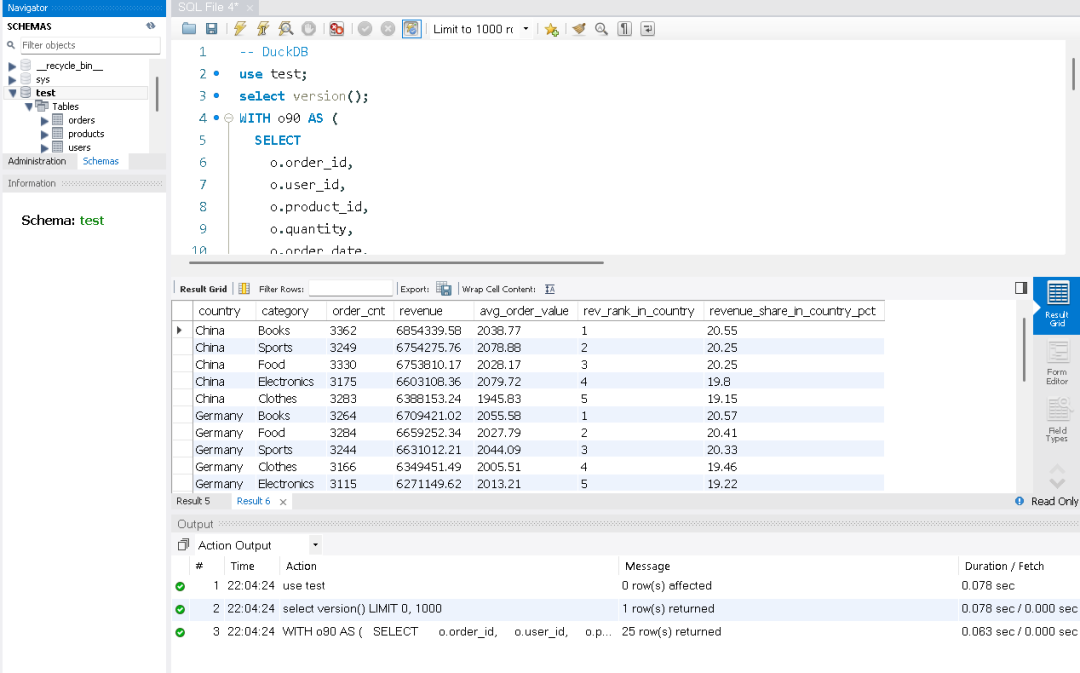 这里我们做一个测试,来看看复杂的SQL在MySQL和DuckDB之间运行的差距。