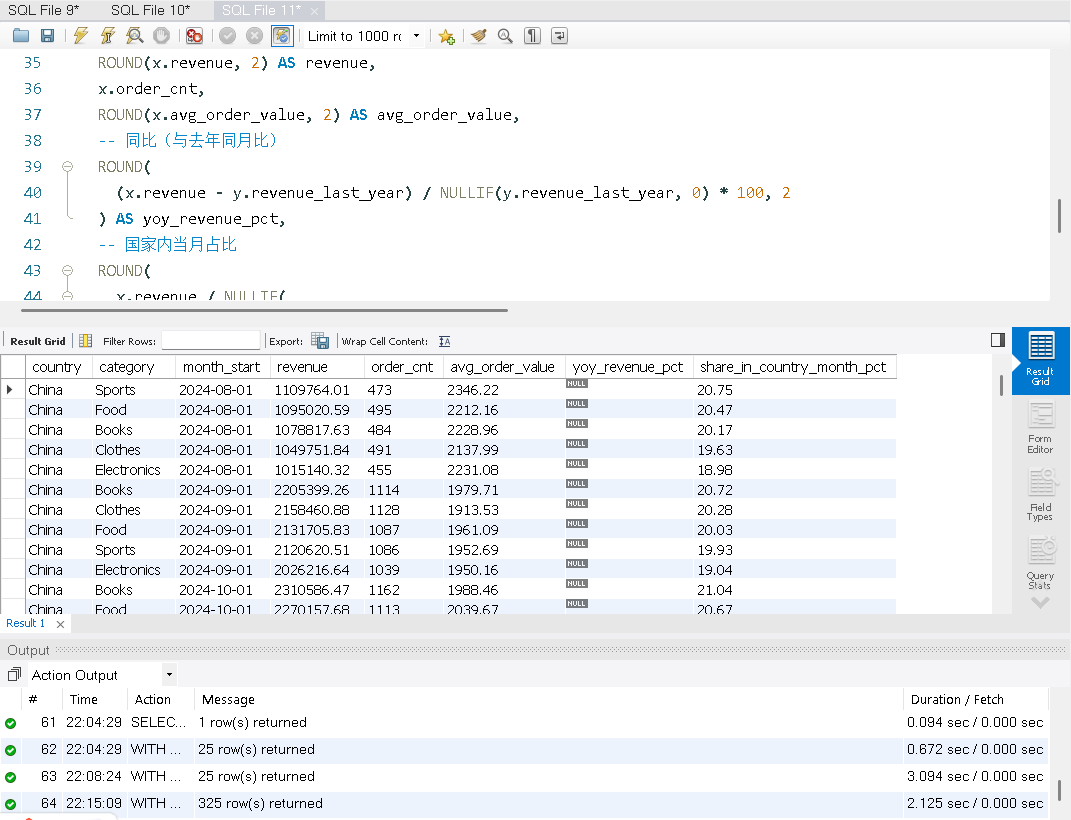 目标:构建 国家 × 品类 × 月 的月度指标(收入、订单数、客单价),计算 同比 YoY,并给出 国家内占比。最后使用 WITH ROLLUP 输出 国家小计。 WITH o12 AS ( SELECT o.order_id, o.user_id, o.product_id, o.quantity, o.order_date FROM orders o WHERE o.status = 'PAID' AND o.order_date >= DATE_FORMAT(DATE_SUB(CURDATE(), INTERVAL 12 MONTH), '%Y-%m-01') ), mth AS ( -- 基础月度聚合:国家 × 品类 × 月 SELECT u.country, p.category, DATE_FORMAT(o.order_date, '%Y-%m-01') AS month_start, COUNT(DISTINCT o.order_id) AS order_cnt, SUM(o.quantity * p.price) AS revenue, AVG(o.quantity * p.price) AS avg_order_value FROM o12 o JOIN users u ON u.user_id = o.user_id JOIN products p ON p.product_id = o.product_id GROUP BY u.country, p.category, DATE_FORMAT(o.order_date, '%Y-%m-01') ), mth_y AS ( -- 为计算同比,准备去年的同月指标 SELECT country, category, DATE_FORMAT(DATE_ADD(STR_TO_DATE(month_start, '%Y-%m-%d'), INTERVAL 12 MONTH), '%Y-%m-01') AS month_start, -- 映射到“今年同月” revenue AS revenue_last_year FROM mth ) SELECT x.country, x.category, x.month_start, ROUND(x.revenue, 2) AS revenue, x.order_cnt, ROUND(x.avg_order_value, 2) AS avg_order_value, -- 同比(与去年同月比) ROUND( (x.revenue - y.revenue_last_year) / NULLIF(y.revenue_last_year, 0) * 100, 2 ) AS yoy_revenue_pct, -- 国家内当月占比 ROUND( x.revenue / NULLIF( SUM(x.revenue) OVER (PARTITION BY x.country, x.month_start), 0 ) * 100, 2 ) AS share_in_country_month_pct FROM mth x LEFT JOIN mth_y y ON y.country = x.country AND y.category = x.category AND y.month_start = x.month_start -- 输出国家小计(ROLLUP) ORDER BY x.country, x.month_start, x.revenue DESC;