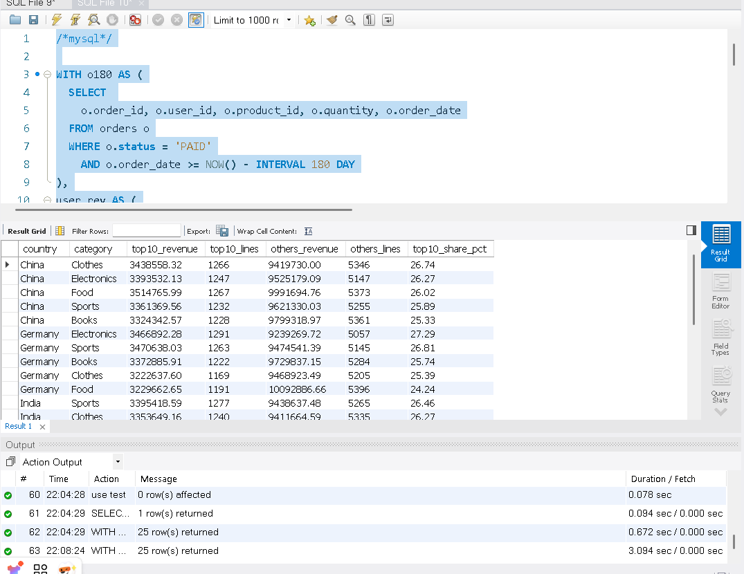 目标:先在每个国家内按 用户近 180 天总消费 做十分位分层(NTILE(10)),把 Top10% 作为高价值用户,与“其余用户”对比,按 国家 × 品类 汇总对比贡献。 WITH o180 AS ( SELECT o.order_id, o.user_id, o.product_id, o.quantity, o.order_date FROM orders o WHERE o.status = 'PAID' AND o.order_date >= NOW() - INTERVAL 180 DAY ), user_rev AS ( -- 每位用户在 180 天内的总消费(用于分层) SELECT u.user_id, u.country, SUM(o.quantity * p.price) AS user_revenue_180d FROM o180 o JOIN users u ON u.user_id = o.user_id JOIN products p ON p.product_id = o.product_id GROUP BY u.user_id, u.country ), user_seg AS ( -- 在各国家内按用户总消费分十分位,1=最高 SELECT user_id, country, user_revenue_180d, NTILE(10) OVER (PARTITION BY country ORDER BY user_revenue_180d DESC) AS decile_in_country FROM user_rev ), base AS ( -- 还原到订单明细,打上用户的分层标签 SELECT us.country, us.decile_in_country, p.category, (o.quantity * p.price) AS amount FROM o180 o JOIN user_seg us ON us.user_id = o.user_id JOIN products p ON p.product_id = o.product_id ) SELECT country, category, -- 高价值用户(Top10%,decile=1) ROUND(SUM(CASE WHEN decile_in_country = 1 THEN amount END), 2) AS top10_revenue, COUNT(CASE WHEN decile_in_country = 1 THEN 1 END) AS top10_lines, -- 其余用户 ROUND(SUM(CASE WHEN decile_in_country <> 1 THEN amount END), 2) AS others_revenue, COUNT(CASE WHEN decile_in_country <> 1 THEN 1 END) AS others_lines, -- Top10% 在该国家×品类中的贡献占比 ROUND( SUM(CASE WHEN decile_in_country = 1 THEN amount END) / NULLIF(SUM(amount), 0) * 100, 2 ) AS top10_share_pct FROM base GROUP BY country, category ORDER BY country, top10_share_pct DESC, category;