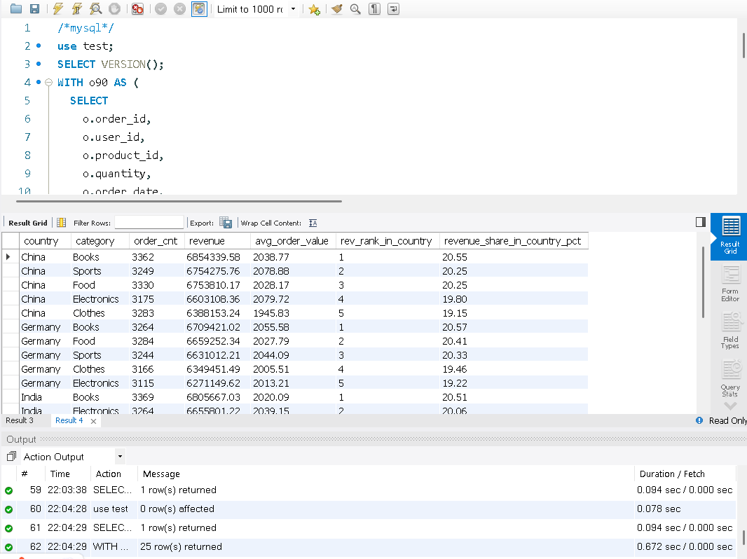 目标:统计最近 90 天各国家、各品类的销售额/订单数/客单价,并计算在国家内的 排名 与 贡献占比。 特点:WITH CTE、三表 JOIN、窗口函数 RANK()、分区内占比、条件过滤。 WITH o90 AS ( SELECT o.order_id, o.user_id, o.product_id, o.quantity, o.order_date, o.status FROM orders o WHERE o.status = 'PAID' AND o.order_date >= NOW() - INTERVAL 90 DAY ), base AS ( SELECT u.country, p.category, o.order_id, (o.quantity * p.price) AS amount FROM o90 o JOIN users u ON u.user_id = o.user_id JOIN products p ON p.product_id = o.product_id ), agg AS ( SELECT country, category, COUNT(DISTINCT order_id) AS order_cnt, SUM(amount) AS revenue, AVG(amount) AS avg_order_value FROM base GROUP BY country, category ) SELECT a.country, a.category, a.order_cnt, ROUND(a.revenue, 2) AS revenue, ROUND(a.avg_order_value, 2) AS avg_order_value, RANK() OVER (PARTITION BY a.country ORDER BY a.revenue DESC) AS rev_rank_in_country, ROUND( a.revenue / NULLIF(SUM(a.revenue) OVER (PARTITION BY a.country), 0) * 100, 2 ) AS revenue_share_in_country_pct FROM agg a ORDER BY a.country, rev_rank_in_country, a.revenue DESC;