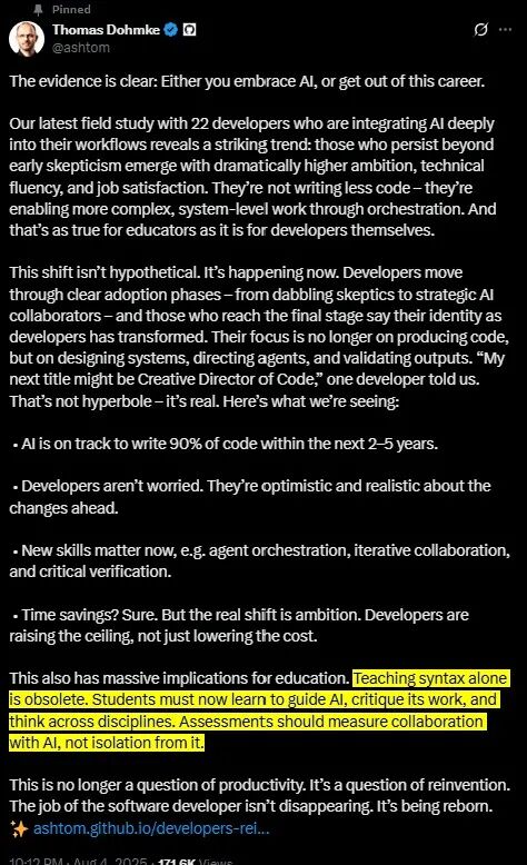 关于X,他的观点更加直接:“仅仅教授语法已经过时了。学生现在必须学会引导人工智能,批判其工作,并跨学科思考。 ” 学校不应该教“编写这个循环”,而应该教“理解这段代码的作用,以及如果修改它会导致什么问题”。