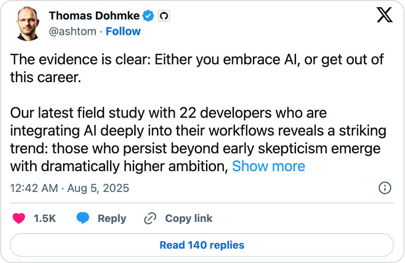 多姆克在 X 平台上如此写道:“证据很明显:要么拥抱人工智能,要么放弃这个职业”,并引用了他的新博客文章“