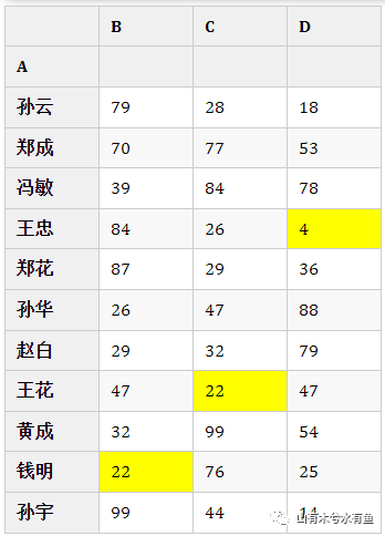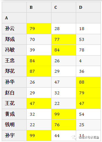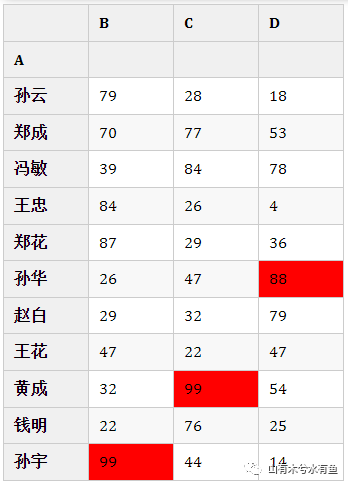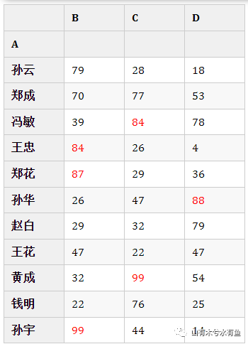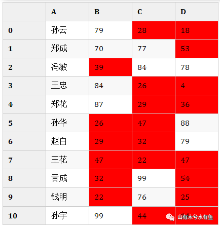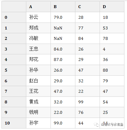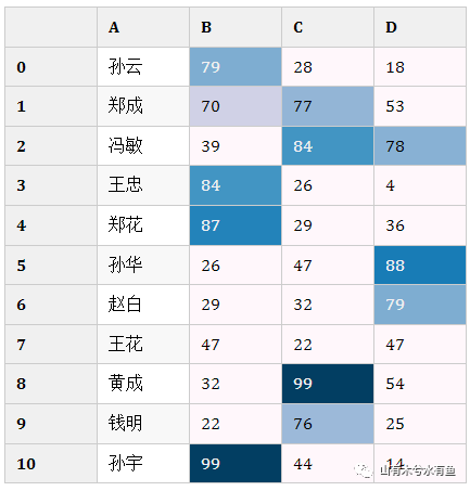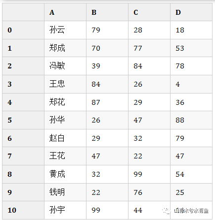 #读取数据 import pandas as pd import numpy as np df = df = pd.DataFrame( { 'A' : [ '孙云' , '郑成' , '冯敏' , '王忠' , '郑花' , '孙华' , '赵白' , '王花' , '黄成' , '钱明' , '孙宇' ], 'B' : [ 79 , 70 , 39 , 84 , 87 , 26 , 29 , 47 , 32 , 22 , 99 ], 'C' : [ 28 , 77 , 84 , 26 , 29 , 47 , 32 , 22 , 99 , 76 , 44 ], 'D' : [ 18 , 53 , 78 , 4 , 36 , 88 , 79 , 47 , 54 , 25 , 14 ]}) df