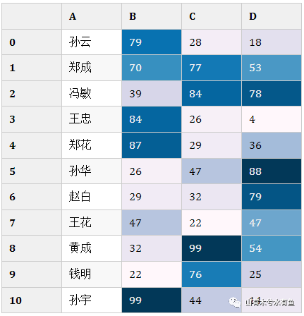 #指定列进行比较 df.set_index( 'A' ).style.highlight_max(subset = [ 'B' ]) 背景渐变 eg. 用不同的颜色来标注成绩,背景颜色越深,成绩越高