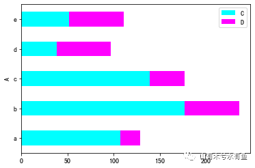 df.assign(a = df.C- 70 ).plot.bar() df.plot.bar(stacked = True ) df.plot.barh(stacked = True ) df.head( 5 ).plot.barh(stacked = True ,colormap= 'cool' ) hist:直方图 直方图用于展示数据的分布情况