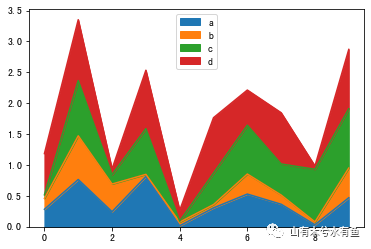 np.random.seed( 123 ) df4 = pd.DataFrame(np.random.rand( 10 , 4 ),columns = [ 'a' , 'b' , 'c' , 'd' ]) df4 一组数据的面积图