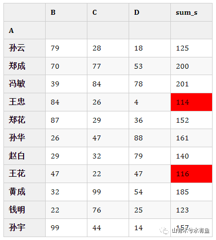 #通过使用.assign() 来计算学生三门课程的总分和平均值 (df.set_index( 'A' ).assign(sum_s = df.set_index( 'A' ).sum(axis = 1 )) .style.applymap( lambda x: 'background-color:red' if