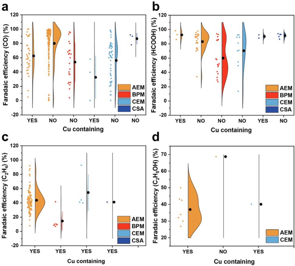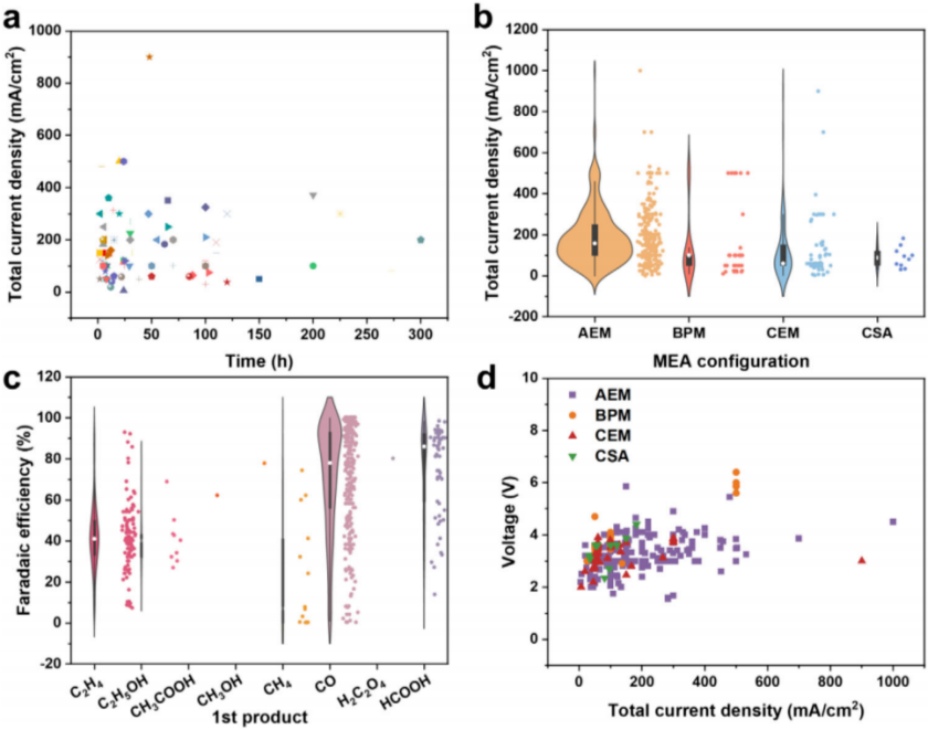 图2. a)总电流密度作为稳定时间函数的散点图,不同的符号代表不同的文献;b)总电流密度作为MEA构型函数的小提琴图;c)法拉第效率作为第一产物函数的小提琴图;d)电压作为总电流密度函数的散点图,不同的符号表示不同的MEA构型。