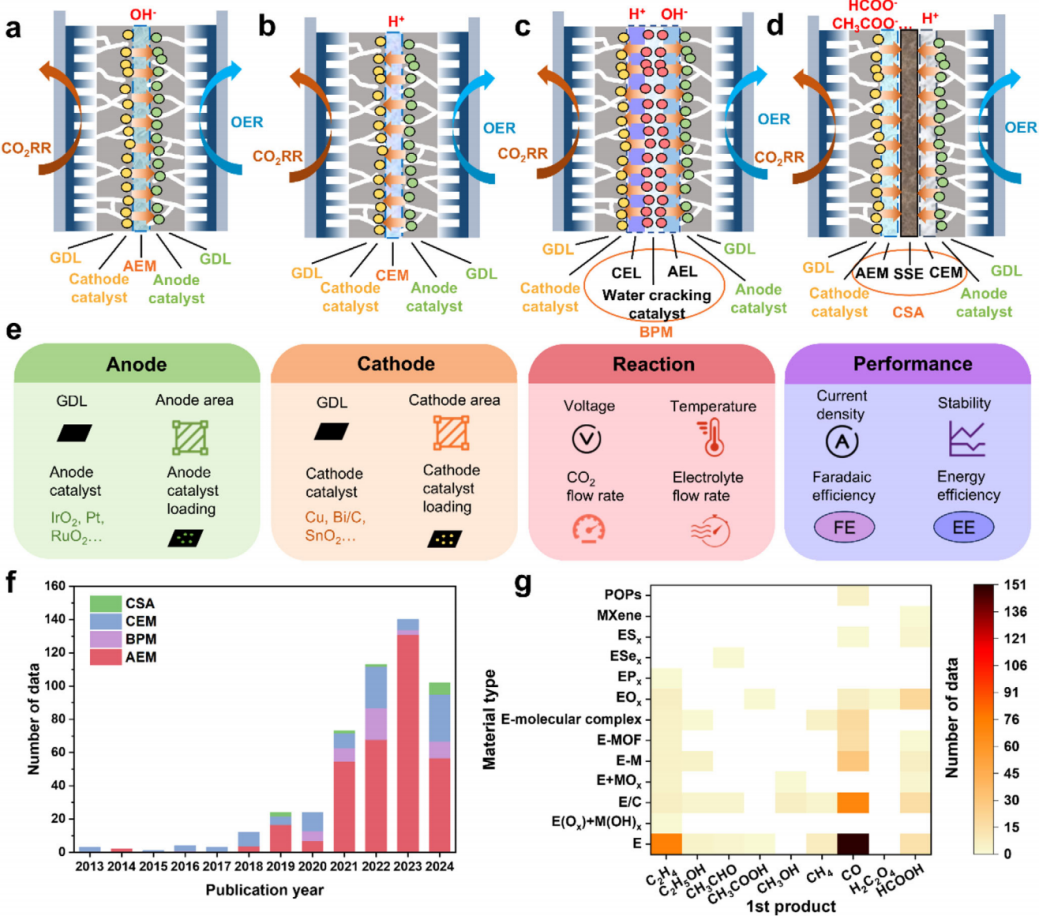 图1. a-d) MEA构型:AEM、CEM、BPM、CSA;e) MEA参数;f) 过去12年中电催化CO2还原相关MEA发表论文的堆积柱状图;g) 展示了具有第一产物的电催化剂数据点数量的热图。