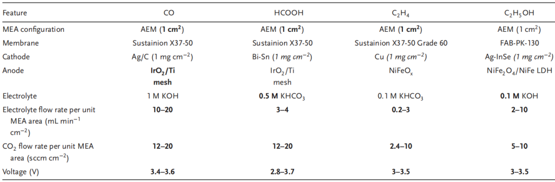 表1. 用于CO2电解的MEA特征推荐组合。修改后的参数字体用粗体表示,补充的参数字体用斜体表示。