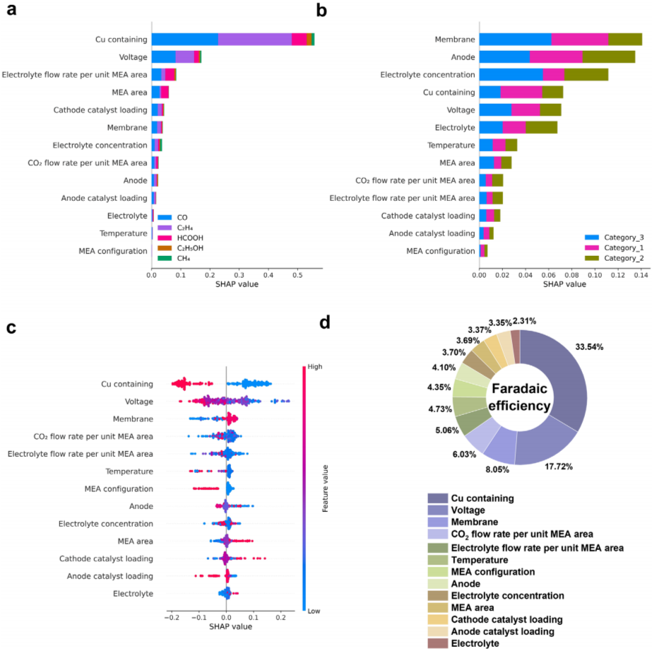 图7. SHAP分析:a)第一产物;b)总电流密度;c-d)第一产物法拉第效率。