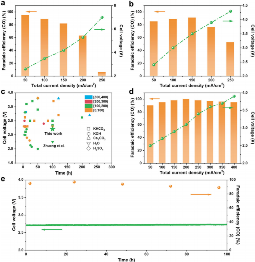 图8. 在 1 M KOH溶液中,使用 MEA 电解槽a)Sustainion X37-50 或b)Nafion 117 作为离子交换膜时,CO的法拉第效率以及Ag/C的总电流密度;c)Ag/C-HT和在MED3数据集中已报道的MEA稳定性,符号的颜色和形状分别代表总电流密度和电解液;d)使用 MEA(Sustainion X37-50 膜,阴极催化剂Ag/C-HT)在纯水中的CO法拉第效率以及总电流密度;(e)在纯水中 100 mA cm−2条件下对Ag/C-HT的长期稳定性测量。