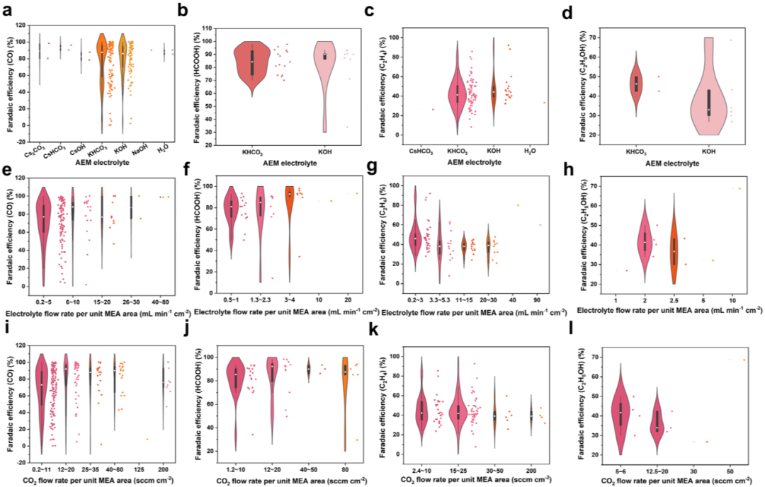 图3. 不同产物法拉第效率作为a-d)AEM电解液,e-h)单位MEA面积电解液流速,i-l)单位MEA面积CO2流速函数的小提琴图。