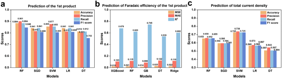 图6. a)RF、SGD、SVM、LR、DT预测第一产物的结果;b)XGBoost、RF、GB、DT、Ridge法预测第一产物法拉第效率的结果;c) RF、SGD、SVM、LR、DT预测总电流密度的结果。