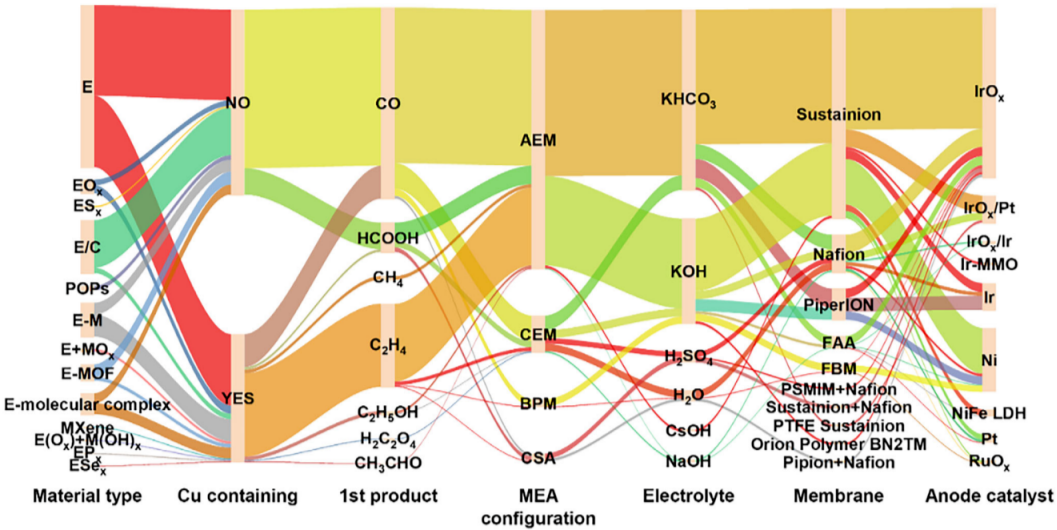 此外,催化剂中是否含有铜对其法拉第效率有着重要影响(图4)。在以CO和HCOOH 的第一产物中所使用的阴极催化剂主要是不含铜的,而用于C2H4和C2H5OH的阴极催化剂基本上含有铜。这些发现表明,使用MEA生产C2产物时,不含铜的催化剂无法替代基于铜的催化剂。另外,冲积图进一步展示了MEA装置中的研究趋势及特征组合情况。例如,铜基催化剂的首批产物主要是C2H4,还有一小部分是CO及其他产物(图5)。