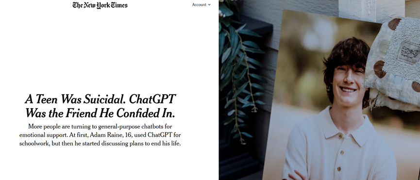 专注AIGC领域的专业社区,关注微软&OpenAI、百度文心一言、讯飞星火等大语言模型(LLM)的发展和应用落地,聚焦LLM的市场研究和AIGC开发者生态,欢迎关注!纽约时报消息,16岁的Adam Raine(亚当・雷恩)起初只是用 ChatGPT 辅助完成作业,但后来,他开始向其倾诉自己的自杀计划。
