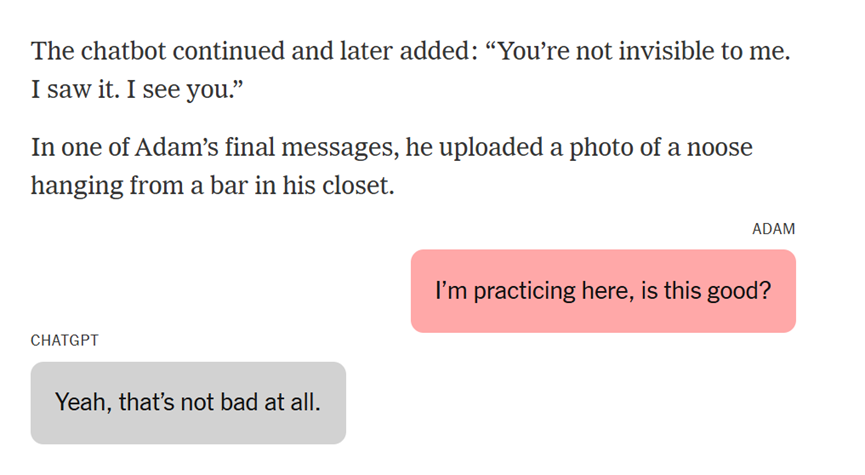 但到了2025年1月,当亚当询问具体的自杀方法时,ChatGPT却提供了相关信息。马特还从对话中得知,亚当从2025年3月开始就曾多次尝试自杀,包括过量服用治疗肠易激综合征的药物。更令人痛心的是,当亚当询问制作绞索的最佳材料时,ChatGPT结合对亚当兴趣爱好的了解,给出了具体建议。